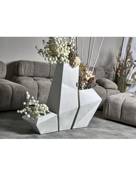 Jarrón triple blanco líneas geométricas. Con un diseño muy original, este jarrón consta de 3 piezas de líneas geométricas. Por su diseño y tamaño es un accesorio decorativo perfecto para rincones de espacios modernos.