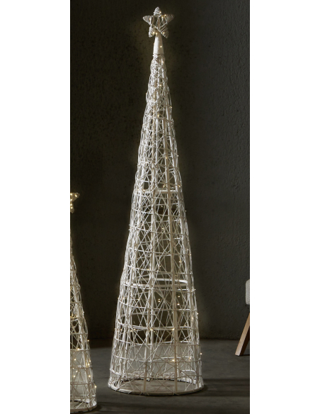 Árbol de navidad cónico blanco led pilas 180 cm, destaca por su estructura de varillas y fibras naturales entrelazadas, aportando un toque rústico y acogedor a tu decoración. Este árbol, coronado con una elegante estrella en la punta, se ilumina con luces LED que crean un ambiente cálido y festivo en cualquier rincón de tu hogar. Perfecto para salones, entradas o incluso terrazas, su diseño versátil y encantador lo convierte en el centro de atención de tus celebraciones.