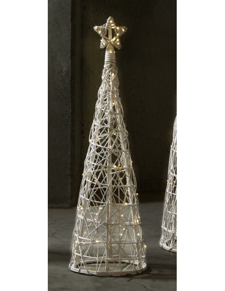 Árbol de navidad cónico blanco led pilas 100 cm, destaca por su estructura de varillas y fibras naturales entrelazadas, aportando un toque rústico y acogedor a tu decoración. Este árbol, coronado con una elegante estrella en la punta, se ilumina con luces LED que crean un ambiente cálido y festivo en cualquier rincón de tu hogar. Perfecto para salones, entradas o incluso terrazas, su diseño versátil y encantador lo convierte en el centro de atención de tus celebraciones.