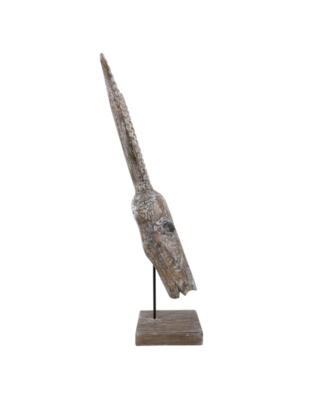 Figura ethnic Antílope blanqueada, esta pieza única y estilizada combina arte y naturaleza, ideal para añadir carácter a cualquier espacio. La base de madera y los dos soportes metálicos aseguran estabilidad y un toque industrial, mientras que el cráneo calado de animal, cuidadosamente esculpido en madera, presenta un acabado blanco gastado que realza su aspecto vintage y envejecido. Perfecta para salas de estar, oficinas o como elemento decorativo en entradas, esta escultura es una opción moderna y sofisticada