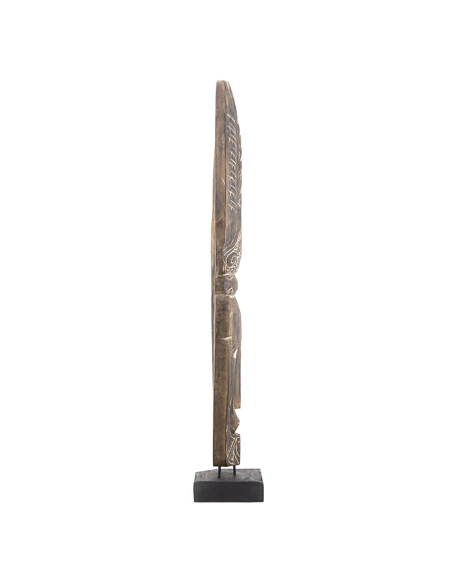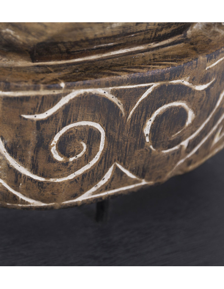 Figura indígena en madera, esta pieza única combina arte y tradición en un diseño impactante y sofisticado. La base de madera proporciona estabilidad, mientras que tres soportes metálicos sostienen la escultura, permitiéndole destacar en cualquier espacio. La superficie de madera está meticulosamente calada con intrincados dibujos tribales que rodean un rostro, creando una obra de arte que evoca cultura y simbolismo. Perfecta para salas de estar, oficinas o espacios de estilo bohemio o contemporáneo, esta escultura aporta una estética fuerte y un toque de misterio, ideal para quienes buscan piezas decorativas llenas de significado.
