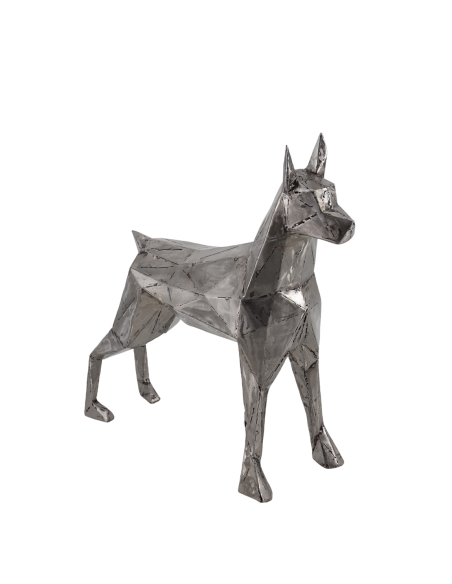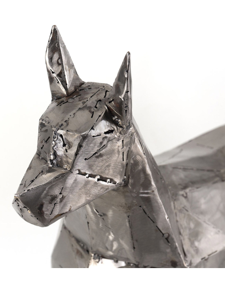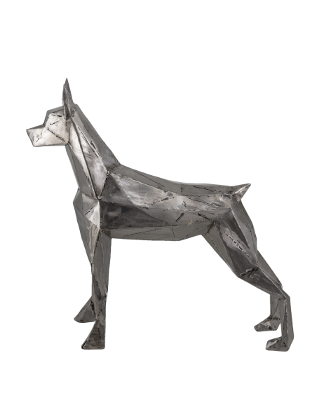 Figura perro metal, esta pieza de arte contemporáneo es una representación única y estilizada de un Doberman, construida mediante triángulos de metal cuidadosamente soldados para crear una figura geométrica moderna. Ideal para espacios de estilo industrial o contemporáneo, esta figura decorativa es perfecta para aquellos que buscan una pieza de arte llamativa y con carácter para su hogar u oficina.