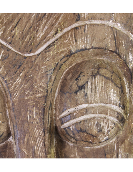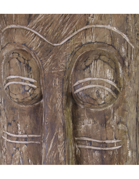 Figura tótem grande rostro, esta pieza única y artesanal presenta un rostro indígena meticulosamente tallado, con detalles calados que aportan una profundidad visual impresionante. La base de madera sólida sostiene la escultura, mientras que tres soportes metálicos proporcionan estabilidad y estilo industrial. Con su diseño detallado y su evocación cultural, esta escultura es ideal para quienes buscan añadir un toque de arte y sofisticación a su hogar, creando un ambiente de armonía y conexión con las raíces ancestrales.