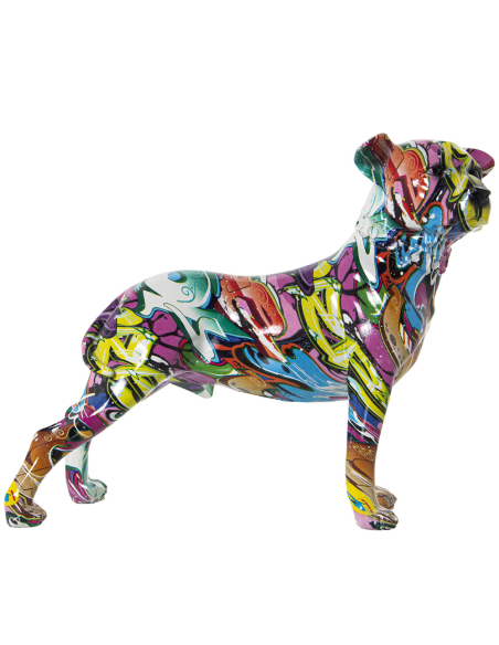 Figura perro de resina grafiti multicolor, destaca por su vibrante estilo grafiti urbano. Fabricada en resina duradera, esta pieza está cubierta de patrones abstractos y formas geométricas en colores llamativos, aportando un aire fresco y artístico. El diseño moderno, lleno de energía y creatividad, es ideal para espacios juveniles, estudios o decoraciones que buscan un toque diferente y lleno de personalidad. La figura tiene un acabado brillante que intensifica los tonos y realza el aspecto dinámico del perro, convirtiéndolo en un atractivo foco visual.