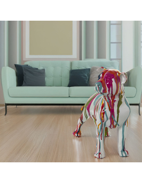 Figura perro de resina multicolor con chorros de pintura, presenta un acabado único de chorros de pintura multicolor que caen fluidamente sobre un fondo blanco. Los colores aplicados con estilo artístico generan un contraste vibrante y moderno, ideal para quienes desean añadir color y creatividad a sus espacios. La postura firme y segura del perro aporta elegancia, mientras que el efecto brillante en la superficie realza el diseño visual. Es una pieza decorativa perfecta para estanterías, escritorios o salas que busquen un toque contemporáneo y lleno de vida.