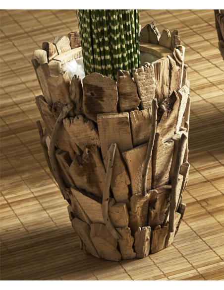 Jarrón decorativo Lascas madera 35 cm, este objeto, que puede ser utilizado tanto como jarrón decorativo como paragüero, está elaborado con lascas de madera de deriva, creando una textura única y un aspecto orgánico. Cada pieza de madera, con sus formas irregulares y sus tonos naturales, cuenta una historia, aportando un carácter auténtico y singular al conjunto. Su diseño versátil se adapta a una variedad de estilos decorativos, desde los más rústicos y bohemios hasta los más modernos y minimalistas. Colócalo en el recibidor, el salón o incluso en un rincón especial de tu dormitorio para añadir un toque de naturaleza y calidez a tu espacio.