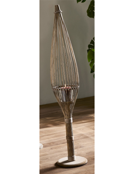 Pie mimbre Hikari natural 110 cm, este porta velas o farol, es un complemento ideal para cualquier ambiente, tanto interior como exterior. Su entramado en mimbre natural permite filtrar la luz de forma sutil y cálida, creando un espacio relajante y acogedor. La forma cónica, junto a su altura, hacen de esta pieza, un elemento distintivo que realza la decoración de cualquier espacio. El mimbre, al ser un material resistente, garantiza una larga duración.