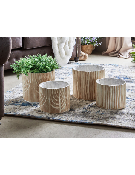 Set 2 centros madera líneas verticales 30 diam., un conjunto que combina la calidez de la madera natural con un diseño moderno y minimalista. Estos centros, de forma circular, presentan un patrón de líneas verticales grabadas en la madera, creando un efecto visual texturizado y atractivo. El set de dos tamaños diferentes te permite jugar con la composición y crear arreglos decorativos dinámicos y originales.