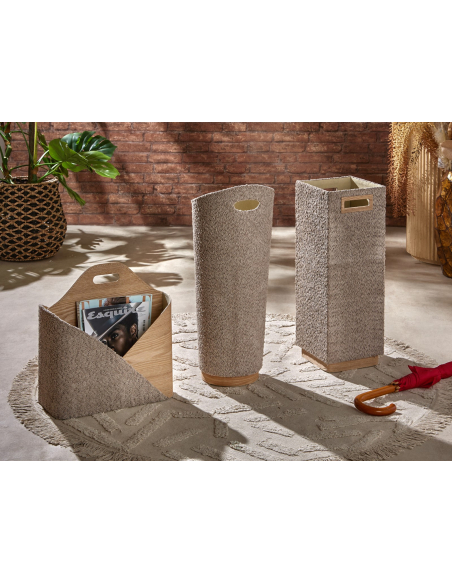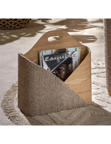 Revistero/organizador rizo suave topo y madera, este organizador presenta una estructura de madera con un lateral recubierto de un tejido de rizo suave en tono gris, creando un contraste de texturas y colores que aporta calidez y estilo. El asa superior, integrada en la estructura de madera, facilita su transporte y añade un toque práctico. Perfecto para colocar junto al sofá, la butaca o la cama, este revistero te permite tener a mano tus revistas, libros o periódicos favoritos, manteniéndolos organizados y añadiendo un toque decorativo a tu espacio.