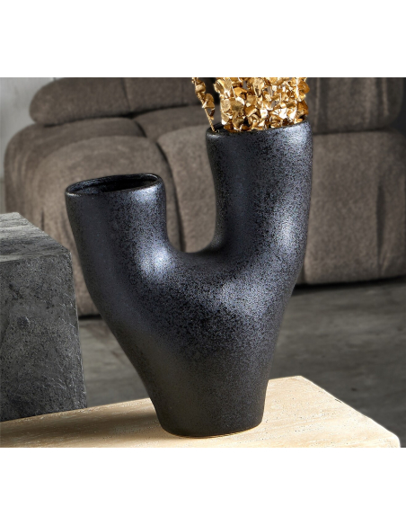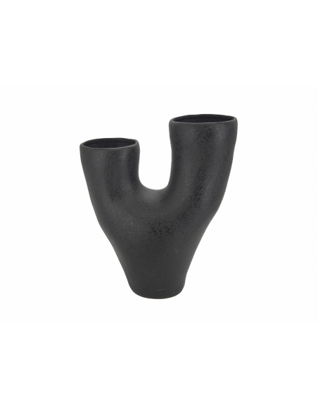 Jarrón decorativo abstracto 2 brazos negro, una pieza escultórica que combina la elegancia del diseño abstracto con la solidez de la cerámica. Este jarrón, con su forma inusual de dos brazos que se elevan desde una base común, crea un efecto visual sorprendente y moderno. El acabado negro, que imita la textura de la piedra, añade un toque de sofisticación y misterio. Más que un simple recipiente para flores, este jarrón es una obra de arte que añade personalidad y carácter a cualquier espacio. Perfecto para colocar sobre una mesa de centro, una consola o una repisa, este jarrón es una invitación a la creatividad y a la contemplación.
