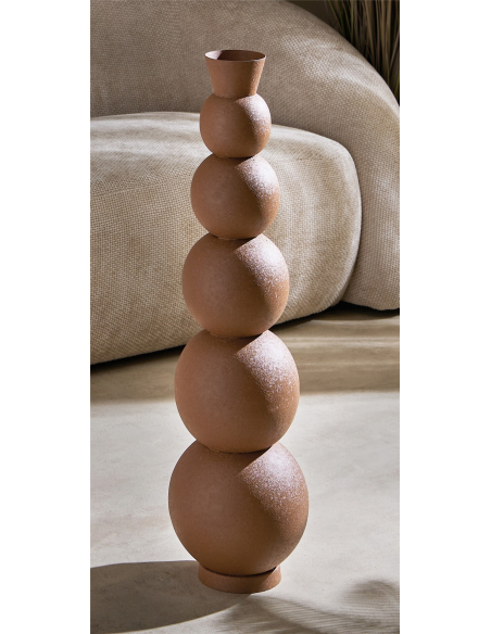 Jarrón decorativo esferas metal terracota 75 cm, desafiando las formas convencionales, este jarrón decorativo se presenta como una audaz escultura contemporánea. Su silueta, compuesta por una audaz superposición de esferas de diferentes tamaños, crea una sensación de equilibrio inestable y dinamismo. El acabado en terracota, aplicado sobre una resistente estructura metálica, le otorga una calidez inesperada, un toque rústico que contrasta con la modernidad de su forma. La pieza parece desafiar la gravedad, como si las esferas estuvieran a punto de rodar, añadiendo un elemento lúdico y sorprendente. Este jarrón no necesita flores para destacar; su sola presencia es suficiente para transformar cualquier rincón en un espacio lleno de arte y personalidad.