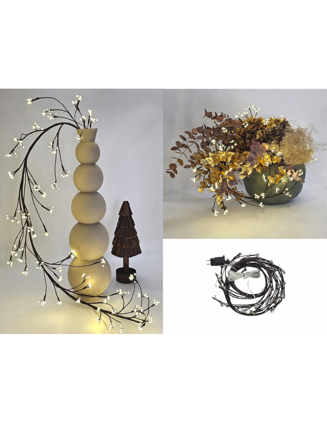 Rama marrón luces led 1,80 m (480 leds), un accesorio decorativo único que simula la forma de una rama natural cubierta con 480 luces LED cálidas. Con 1,80 metros de longitud, es perfecta para colocar en paredes, ventanales o integrar en decoraciones de grandes dimensiones. Su acabado marrón en metal y pvc le da un aspecto realista y elegante que combina fácilmente con distintos estilos. Funciona con cable de 3,5 metros que facilita su conexión. Diseñada para ambientes interiores o exteriores cubiertos, es resistente y segura. Una pieza ideal para crear atmósferas cálidas y originales durante la temporada navideña o en eventos especiales.