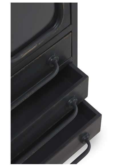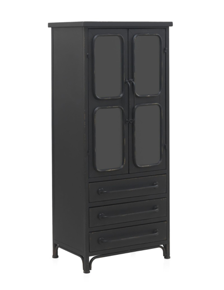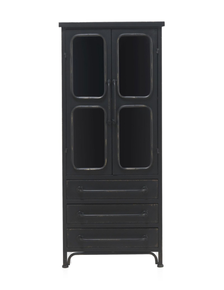 Vitrina Tramontana estructura metal, fabricada íntegramente en metal con un acabado negro envejecido que le otorga una auténtica pátina vintage, esta pieza combina almacenamiento cerrado y cajones para una organización completa. Sus líneas robustas y detalles metálicos la convierten en un mueble con presencia. La vitrina se divide en dos secciones: la superior cuenta con dos puertas metálicas con paneles (posiblemente opacos o de rejilla, según versión) que ocultan estantes interiores, ideales para guardar objetos fuera de la vista. La sección inferior dispone de tres amplios cajones con tiradores metálicos, perfectos para organizar accesorios, documentos u otros enseres. Ideal para salones, comedores, estudios o incluso cocinas de estilo industrial, loft o vintage. Esta vitrina Tramontana no solo ofrece una gran capacidad de almacenamiento, sino que también aporta la fuerza estética y la durabilidad del metal trabajado, siendo una pieza funcional y llena de personalidad.