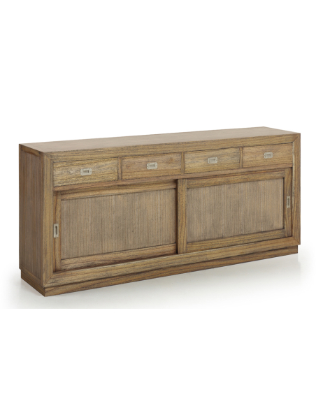 Si necesitas una pieza súper completa para guardar todo tipo de vajilla y menaje esta vitrina Merapi cuatro puertas y cuatro cajones. Su cuerpo está organizado en dos cuerpos combinando dos fondos diferentes. Un cuerpo superior de 40 cm fondo con dos puertas correderas de cristal enmarcadas en madera. En su interior, distribuido en tres huecos y dos estantes podrás colocar la cristalería, copas, vasos, el juego de café y todo lo que quieras que se luzca. La parte inferior de fondo 50 cm se compone de cuatro cajones y dos puertas correderas de madera. Aquí, podrás almacenar la vajilla más pesada, incluyendo fuentes, ensaladeras, etc. Toda la pieza está apoyada sobre un zócalo y rodeada por un enmarcado de madera ingletado, otorgando a la pieza idea de solidez y calidad. Como el resto de la colección, está fabricada en madera de mindi y barnizada en color natural.