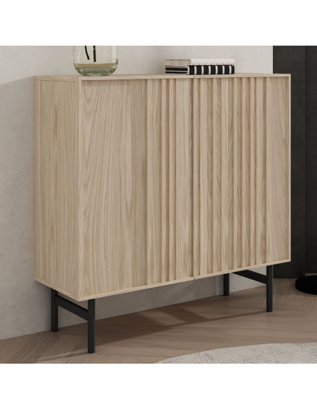 Zapatero Oaku 2 puertas, con una estructura de madera en tono claro, este zapatero presenta dos puertas que se abren para revelar un amplio espacio de guardado, ideal para organizar tus zapatos de manera eficiente. Las patas de metal elevadas en color negro no solo brindan una base sólida, sino que también aportan un toque contemporáneo y elegante, gracias a su diseño con refuerzo que añade robustez y estabilidad. El frente del zapatero destaca por las varillas distribuidas verticalmente, que ofrecen un diseño original y sofisticado, capturando la esencia de la modernidad.
